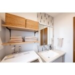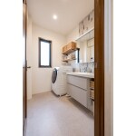 洗面台は、アイカのパーツを組み合わせて作る造作の洗面台です。こちらの壁はタイルを縦に使い、遊び心があるオンリーワンの空間になりました。ランドリー棚やスイッチ、コンセントも空間に合わせてコーディネートしました。