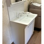 実際に使う人のこと考えられた設計の洗面をご提案させていただきました。 洗面ボウルは泡や髪がスイスイ流れ、気になる汚れもたまりにくい設計です。ボウルの脇には濡らしたくないものを置くドライエリアとコップやせっけんなど濡れたものを置くセミウェットエリアもあり、使う人のことを考えられています。 水栓はお湯との境にカチッというクリック感があり、お湯をお水ときちんと使い分けられるので、お湯のムダ使いを防げます。明るいLED照明を採用し省エネもできます。収納量がたっぷりの化粧台は、大きなものもしっかり入ります。フローリングのきしみ部分を補修し、おしゃれな色味の床を上張りしました。