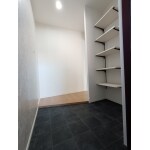 靴の収納スペースは浮かせて設置してあるので、お手入れも簡単ですし、棚の幅が大きいものもあって長靴やブーツも置くことができます。また、ハンガーラックは目に見えない位置に設置しているので、来客があっても安心できます。玄関床は、壁色と対照的な黒を使用し、モノトーンでおしゃれな雰囲気に仕上げています。