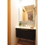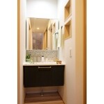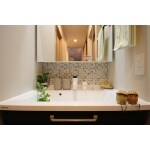 TOTOの既製品、オクターブ。ミラーと洗面ボウルの間にタイルを施工するだけで、まったく違った表情の洗面化粧台になります!
