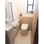 T社のレストパルL型を設置致しました。 背面にタンクが隠れているので、スッキリとした印象になります。 自動水栓の手洗器も設置されているため、快適に過ごすことができます。