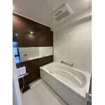 ワイドな鏡とブラウンのアクセントパネルを正面に、他3面の壁と浴槽をホワイトでまとめて、落ち着いた中にも明るい仕上がりの浴室が出来上がりました。 浴槽はご希望通りにホーローで贅沢に。