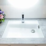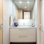 洗面化粧台の三面鏡は特に問題がないということでしたので、下台のみの交換をご提案しました。 三面鏡下の鏡の交換もプランに含め、当初は「鏡・タイル・化粧不燃板」などに取り換えできることをご紹介しましたが、「水の飛び跳ねがあるので、鏡だと汚れが目立つんです…」というお困りの声をお聞きしたため、お掃除しやすいアイカ工業のセラール『メラミン化粧不燃板』をご提案させていただきました。 洗面化粧台のクリスタルカウンタ―の雰囲気に合わせて、床材は足触りの良い、適度なざらつき感にこだわったタイル柄のクッションフロアに。 壁はコンクリートの質感があるものを採用。 全体がグレイッシュで統一され、上質で落ち着いた雰囲気の空間に仕上がりました。
