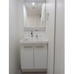 浴室などが設置され湿気が溜まりやすく、カビなどが生えやすいので凹凸の少ない壁紙にしました。ランドリースペースの上には収納棚を設置し予備品の収納にも困りません。浴室の改築を行っていますが、十分な洗面所とランドリースペースが確保できています。