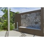アートなタイルのデザインウォールをご提案。ベンチにもなるのでお庭時間に活躍してくれます。テラス屋根とフェンスも施工し、ちょっとした雨の日でもお庭に出ることができます。アンティークレンガや木目調のタイルなど素材にこだわり、落ち着いた雰囲気のお庭に仕上がりました。