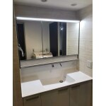 鏡は再利用でとお考えでしたが、一面鏡から三面鏡への変更で収納力を高めることができると提案。洗練されたデザインに加え収納力アップを叶えられる"TOTOオクターブ"にリフォームしました。 従来品は、配管を避けるために引き出し内の収納が狭くなっていましたが、TOTO独自の"奥ひろし収納"はスリムな配管で収納スペースが広くなります。 扉カラーは、清潔感のあるパナシェホワイト。クロスも色を合わせつつシンプルになりすぎないように、大柄のタイル調クロスを選択。まるで高級ホテルのようなオシャレな洗面空間に生まれ変わりました。 施工後には、「まるで自分の家じゃないみたい!」と大変お喜び頂けました。
