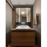 ご希望のLIXILのルミシスを採用いたしました。なんといってもデザイン性に定評のある商品ですが使い勝手も抜群です。LED照明はタッチレススイッチになっており、汚れた手でもサッと点灯できるのが嬉しいですね。フルスライドの収納は中で2段に分かれているので、細かい物から大きなものまで収納しやすい造りとなっております。お選びいただいた黒のモザイクタイルがグレーの壁と上手く調和しています。