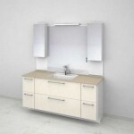 洗面ボールはお洒落で使いやすいスクエア形状。鏡の両サイドには洗面化粧台の上に散らかりがちだった洗面ケア用品の収納スペースが付き、すっきり空間を保てます。横に長く設置された棒状の照明が自然光に近い明るく優しい光でお顔を広範囲に照らし、メイク時間を楽しませてくれます。