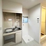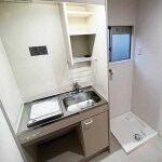 3点ユニットバスをトイレとお風呂を別にして分ける分、やはりキッチンスペースが狭くなりますが、リクシルのミニキッチンは省スペースながら、冷蔵庫置場兼収納スペース、ステンレスシンク、そして節湯シングルレバー水栓・LED照明・換気扇がついたフルユニットキッチンになっています。手の届きやすい高さに水切り棚が付いているので、ちょっとしたお料理・洗い物が可能です。 若者に人気のグレージュの床材に併せ、キッチンのパネルや扉もグレージュ色にしました。シンプルだけどやわらかく優しい色合いです。グレージュは色々な家具に馴染みやすく合わせやすい色合いになっています。お部屋全体の雰囲気が都会的でありながらホッとできる優しい空間になりました。給水給湯配管更新も済ませ、安心して貸し出せるお部屋のご提案をさせて頂くことが出来ました。