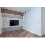 ご要望されていたバリアフリーを実現。 テレビまわりにはエコカラットを貼り、天井から関節照明で照らしてフォーカルポイントとしました。 廊下との壁には造作の室内窓を取り付け、廊下に明かりが行くようにしました。