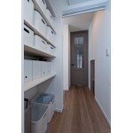 洗面所に向かう廊下に可動棚の収納を造作しました。