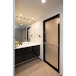 洗面台は大理石調のカウンターにブラックの鏡面扉でホテルライクな脱衣室に。