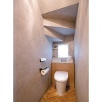 大部分をグレージュコンクリート柄クロスに貼り替えたことで、圧迫感のあった階段が個性的なモニュメントのようになりました。 トイレはシャープなシルエットのリフォレ。掃除用具はキャビネットに収納して、現代的で狭さを感じさせないスマートな空間に生まれ変わりました。