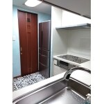 床材や、クロス、キッチンパネル等全体のまとまりを考えてデザイン。アクセントにデザインが入った床材や壁クロスを工夫しました。シンプルな木目のキッチンとも相性がよく、印象的なキッチンに仕上がりました。その他の機能面には、衛生的で節水効果が高いタッチレス水栓を採用。吊戸棚はダウンウォールを取付、収納力や使いやすさが向上しました。