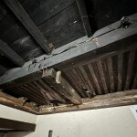早速、現場を見させていただいたところ、かなり天井が下がっていていつ天井が落ちてもおかしくない状況でした。 天井を剥がし、中の躯体を確認させていただいた所、2F廊下側からと思われる付近の鉄部躯体の錆腐食が確認出来ました。 以前2Fから漏水があったということで、ご推察の通り、やはり継続して漏水があり、腐食が進んだものと思われます。2階該当部の状況を確認したところ、外廊下に洗濯機が置かれており、その排水や雨水が廊下と壁の劣化した接続部より漏水して腐食が進んだと思われます。外廊下の壁・床・接続部の防水下地処理と、1Fお部屋の天井の錆びた躯体を取外し、新たにしっかりシャンデリアの重さにも絶えられる躯体を造作補強して、天井を貼り換えさせていただきました。