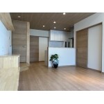 配膳がしやすくコミュニケーションもとれる対面キッチンのカウンター向かいにダイニングスペースを設けることを提案。 キッチンとダイニングの天井をつなげ広く感じられるようにし、天井をいかしたシンプルな埋め込みダウンライトをおすすめしました。