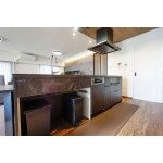 旦那様がお酒を飲むのが好きで、特にご友人と呑むのがお好きとのことでしたので「ダイニングテーブルに6人は座れるようにしたい」とのご希望があり、6人利用を想定したキッチンとダイニングテーブルの位置をプランニングしました。 その際、家事導線にも配慮し、IHクッキングヒーター側にも通路を確保しました。 キッチンはグラフテクトのデュエアイランドをご採用いただきました。ダイニングテーブルもキッチンとお揃いの素材となっています。 照明はテイストに合わせて全て取り替え、ダウンライトも枠が黒色のものを選びました。 ペンダントライトの傘やシーリングライトのデザインはキッチンに合うものをご提案させていただきました。シンク下はオープンスペースにしてゴミ箱置き場に。シンク下をオープンスペースにしたことで収納量が減ってしまったので、カップボードの奥行きを広めの65cmにしてカバーしました。 カップボード横の収納は元々扉付きの上下に分かれたセパレート収納でした。既設の扉を外し、収納の奥行きに合わせて袖壁を新設。新たに扉も設置しました。 収納内部は既設を利用しつつ、見た目をワンランク上のものに魅せるため工夫を凝らしました。