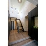 既存の階段を活かし、雰囲気タップリのレトロモダンな玄関になりました! シューズボックスにはコの字を採用し、収納量を確保しつつも、圧迫感が抜けるように配慮しました。 玄関ドアにはリクシルの引き戸を採用しました。 表からは、完全に「和」の雰囲気でお客様をお出迎えし、中に入るとレトロモダン。とてもカッコイイ玄関に仕上げました。