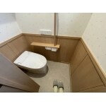 コンパクトな便器に変更し、上部には収納を取り付けました。 紙巻器は手すり兼用タイプを採用し、掃除をしやすい腰壁を取り付けました。