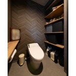 トイレ背面はグレーのヘリンボーンのクロスを採用し、全体をグレーでまとめました。手洗い場もスッキリとしたシンプルなものを造作で設置するご提案をしました。