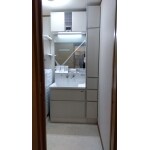 間口は変えず、余っている無駄なスペースをフル活用して 洗濯機 , 洗面化粧台 , トールキャビネット を設置して 残りの隙間を5センチほど確保しました。 上のスペースもフル活用して造作の可動棚を付けるご提案をさせて頂きました。