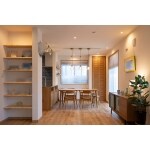 やさしい雰囲気のダイニングをご提案。扉付きのパントリーやダイニングのすぐ横にも収納をつくり、常にすっきり片付く空間になりました。雰囲気に合うようペンダントライトにもこだわりました。