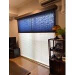 和室改装にあわせて同じアクセントカラーの紺×白のプリーツスクリーンを掃き出し窓に。 すっきりとした和モダンなテイストで和室とリビングに統一感が生まれました!