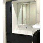 お客様のお悩みでした引き戸側にトールキャビネットをご提案しました。収納量も増え、家事導線も落ち着き、壁紙全体も貼り替えることで快適な洗面室となりました。クレヴィのミラーキャビネットにはLEDライト照明、家電から小物まで使いやすくしまえる仕切りトレイなど生活の使い勝手UPポイントも備わっています。