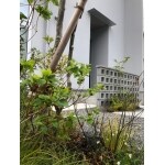 境界フェンスもシンプルなスチールフェンスにし、使っているタイルも白いものを選びました。 白とウッドデッキや植栽の植物の色で統一して一体感を演出しています。