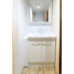 収納付3面鏡のある洗面化粧台に交換しました。 洗面所と浴室に2室連動の天井換気扇を新しく設けました。