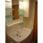Noritz(ノーリツ)・「シャンピーヌS」。 幅30cmの収納を取付け、予備のシャンプーやタオルなどを収納するのに便利です。