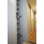 収納は天井までの造作収納としました。家全体を同系色のトーンでまとめていますので、扉もメーカードア色を採用しています。ドアノブは本来共用部分となりますが、古くなりそれぞれ個々に変えているということでしたので、レバーハンドルに取替えることができました。