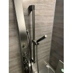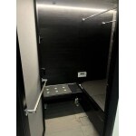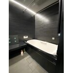 L社のスパージュPZタイプを設置致しました。 ブラックを基調としたパネルと浴槽、お洒落なライン照明は圧倒的な高級感を放っています。床は「グランフロア」といって落ち着いた木目柄で、一般的な浴室床を比べて、質感や雰囲気もだいぶ違いますし、お洒落度Maxです。