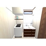 洗面台横の洗濯機置き場の上部にアッパーキャビネットと棚板を設置して、使い勝手の良い洗面室になりました。