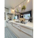 気になっていたキッチンの暗さも吊り戸棚をなくしたことで解消できました。 真っ白な清潔感のあるキッチン!また「ハンズフリー水栓」は超節水でお手入れも楽々です