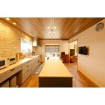 1)北東にあった勝手口の下屋を大型パントリーに 2)框付き扉のキッチン、エージング加工がされたタイルでカントリー風に 3)キッチンを壁際に設置し大型アイランドを設けて自由な動線に