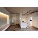 キッチンの配置替えでできたスペースに収納棚をつくり、新設した間仕切り壁に巾広のテレビ台をつくりました。