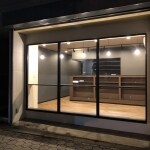 4枚引き込み扉を設け店舗とガレージを仕切りました。開放する場合には右から2枚目部分に4枚を集約し、厨房側も、店舗お客様ゾーン側もフルオープンな状態になります。