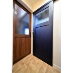 洗面脱衣室内から見た写真です。テイストが違うドアですがインテリア好きの奥様が選ばれただけあって、狭い空間でも違和感なくマッチしています。
