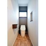 お子様たちの希望もあり、トイレの奥行を広げました。 埋込収納や棚を取り払って新たにニッチ棚を設け、広く使いやすいトイレになりました。テラコッタ調のクッションフロアはご家族にも好評だそうです。