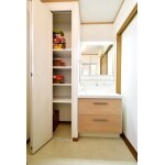 洗面化粧台の位置を変え、隣に可動棚を新設。可動棚は棚の位置(高さ)を変えられるので、収納したい物の高さに応じて収納ができてとても便利です。