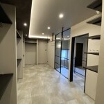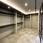 落ち着いた雰囲気をご希望でしたので、内装はダーク系で統一し、床は大理石調にすることで高級感を演出、棚には間接照明を配置して、ホテルライクな空間にいたしました。 元々の洋室は間取り変更によりさらに広くなりましたので、洋服を含め収納力も十分、朝の準備もスムーズに、暮らしにゆとりも生まれます。 また、廊下との間仕切りはガラスの間仕切りを採用しているので、まるで高級洋服店を思わせるウォークインクローゼットが完成いたしました。
