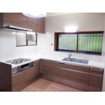 老朽化したキッチンを、リフォームを機にスッキリできないかとご相談を承りました。 L字型のキッチンと同じレイアウトで壁に設置されてあった吊戸棚は、必要な収納量と見た目のバランスを考慮しレンジフード側だけ残しました。 瞬間湯沸かし器がありましたが、スッキリした見た目を叶えるためにキッチン裏の外壁に給湯器設置を提案。 据え置きタイプからビルトインに変わったガスコンロは、施主様が使い勝手の良さを吟味し選定されたリンナイのデリシアを採用しました。 扉は明るい木目のシェードブラウンを選定。ご希望であったグラニュールホワイトの人造大理石カウンターとコントラストを楽しめるグレーのシンクが、カラー選定のポイントです。