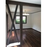 アジアンウォールナットの無垢床材を採用し、心地良いレトロな風合いに。壁は自然素材スイス漆喰を左官塗りで仕上げました。