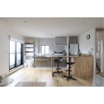 自然光が入る明るいスペースに壁付キッチンを配置しました。造作したカウンターは収納も兼ね備えており、キッチン台の横にも収納棚を設置。常にスッキリした空間となるよう設計しました。