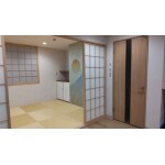 1F和室。海外からのお客様に喜んで頂けるよう、富士山の壁紙をアクセントにしました。