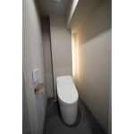 夜間の利用に目が覚めやすいトイレを間接照明とするご提案。収納もすっきりと隠せたことでミニマルな空間にもなっている。