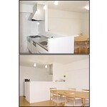 お客様のご希望によりキッチンと室内を白色で統一しました。 壁側のキッチンは吊戸なしのオープン型対面キッチンに入れ替え、天井のシーリングは簡易取付型のスポットライトに替えて手元を明るくしました。