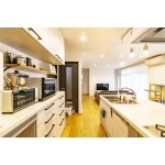 広いスペースを活かして、家族の様子が見えやすい、対面式のアイランドキッチンをご提案。周りからも見えやすくなるために、隠せる収納としてのカウンター収納、パントリーを設置しました。奥にはファミリークローゼットも設けた為、リビング収納としても活用でき、片づけやすい環境を作れました。
