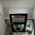 「レストパルF」のL型をご採用にあたり、現状では奥行不足で設置できない事がわかりました。そこで、便器後ろのカウンターと壁を一度壊して奥行寸法を確保し、新たにカウンターとレストパルF設置に耐えられる強度のある壁下地を作り直すご提案をしました。 床は非住宅にも使われている汚れに強い東リの消臭NSトワレNWをご提案いたしました。 壁天井のクロスも汚れに強いタイプをご採用いただきました。